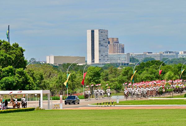 初夏時(shí)節(jié)的巴西利亞,天朗氣清。黎明宮內(nèi),綠草如茵,450名威武禮兵整齊列隊(duì)。在120名龍騎兵護(hù)衛(wèi)下,習(xí)近平乘車抵達(dá)黎明宮前廣場(chǎng)。