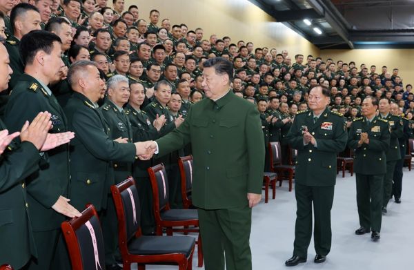 12月4日,中共中央總書記、國家主席、中央軍委主席習近平視察信息支援部隊,代表黨中央和中央軍委,對信息支援部隊第一次黨代表大會的召開表示熱烈祝賀,向信息支援部隊全體官兵致以誠摯問候。這是習近平同代表們親切握手。新華社記者 李剛 攝