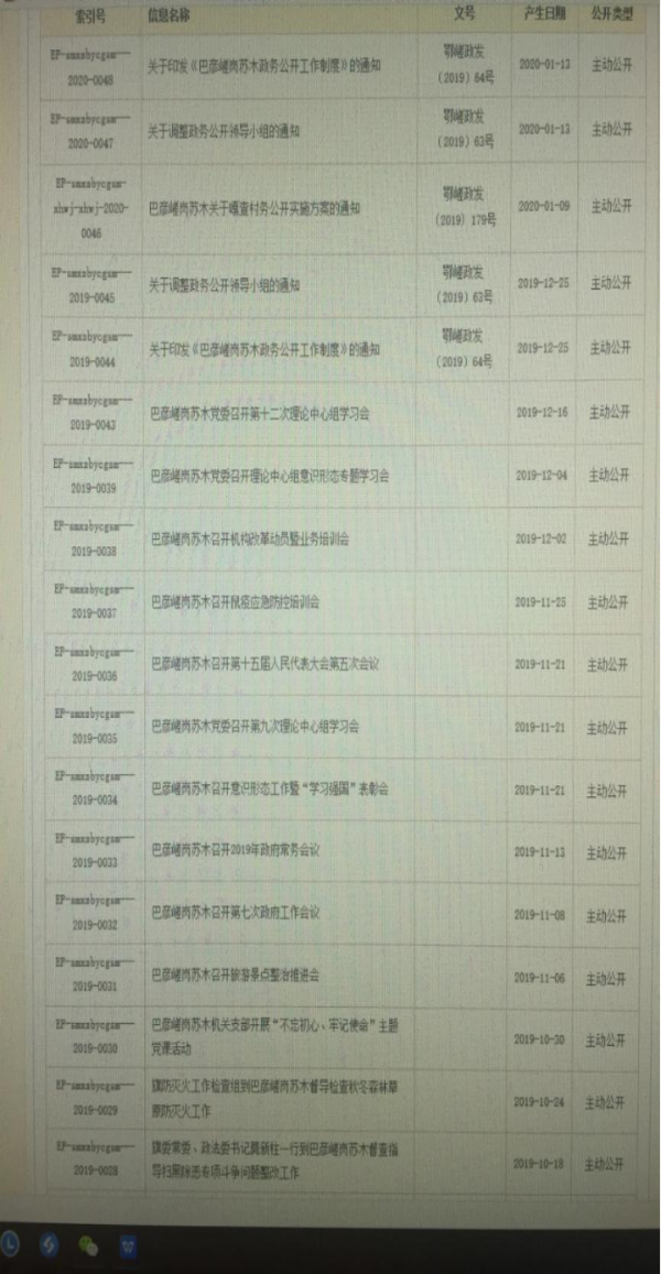 1、健全政務(wù)公開領(lǐng)導(dǎo)機(jī)制,將政務(wù)公開工作列入領(lǐng)導(dǎo)分工。2019年4月份,制定了《關(guān)于調(diào)整政務(wù)公開領(lǐng)導(dǎo)小組的通知》(鄂嵯政辦發(fā)〔2019〕63號)及《關(guān)于印發(fā)巴彥嵯崗蘇木政務(wù)公開工作制度通知》(鄂嵯政發(fā)〔2019〕64號),并在旗政府門戶網(wǎng)站公開發(fā)布。調(diào)整了以蘇木達(dá)敖云達(dá)喜為組長、副蘇木達(dá)魯燕為副組長、各科室負(fù)責(zé)人為成員的政務(wù)公開領(lǐng)導(dǎo)小組,負(fù)責(zé)對政務(wù)公開工作的指導(dǎo)和日常工作,抓好政務(wù)公開工作的落實(shí)。為方便收集資料、滿足工作需要,我蘇木將政務(wù)公開辦公地點(diǎn)設(shè)在政辦,保證政務(wù)公開工作順利開展。