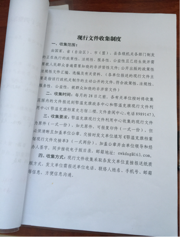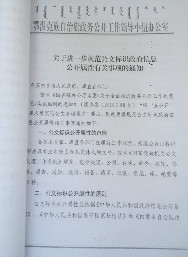 5、規(guī)范政務(wù)公開辦文流程。嚴(yán)格按照《鄂溫克族自治旗政府信息公開申請須知》、《鄂溫克族自治旗2019年政務(wù)公開工作要點(diǎn)》和《如何做好政府公文公開屬性標(biāo)識的認(rèn)定》的圖文解讀文件、《關(guān)于進(jìn)一步規(guī)范公文標(biāo)識政府信息公開屬性有關(guān)事項(xiàng)的通知》等相關(guān)文件要求,嚴(yán)格執(zhí)行政府信息公開保密審查、公開屬性源頭認(rèn)定和發(fā)布協(xié)調(diào)機(jī)制,規(guī)范公文公開屬性標(biāo)注,明確主動公開、依申請公開、不予公開等屬性。認(rèn)真做好政府公開信息的保密審查和移交工作。按季度向旗檔案史志館、政務(wù)服務(wù)中心及時公開現(xiàn)行文件。本年度,共報送現(xiàn)行文1件。