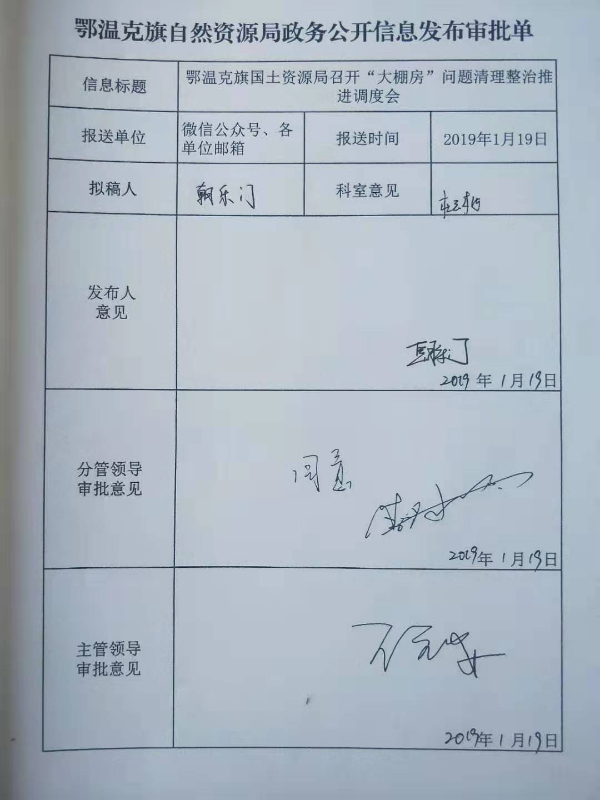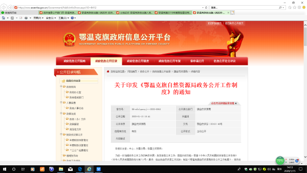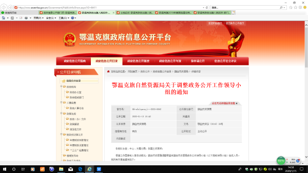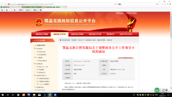 2、健全政務(wù)公開(kāi)領(lǐng)導(dǎo)機(jī)制,將政務(wù)公開(kāi)工作列入領(lǐng)導(dǎo)分工。2019年6月份,制定了《鄂溫克旗自然資源局關(guān)于調(diào)整政務(wù)公開(kāi)工作領(lǐng)導(dǎo)小組的通知》(鄂自然資字〔2019〕39號(hào)),并在旗政府門(mén)戶(hù)網(wǎng)站公開(kāi)發(fā)布。