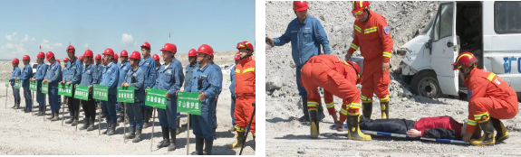 本次滑坡事故應(yīng)急演練采取實(shí)戰(zhàn)演練方式。演練當(dāng)日10時,生產(chǎn)部當(dāng)班調(diào)度現(xiàn)場指揮生產(chǎn)時發(fā)現(xiàn)內(nèi)排土場620水平出現(xiàn)局部滑坡,同時因降雨天氣有二次滑坡的風(fēng)險,隨即立刻向礦調(diào)度指揮中心匯報??傊笓]接到滑坡事故匯報后啟動滑坡事故專項(xiàng)應(yīng)急預(yù)案,應(yīng)急救援指揮部各小組組長接到總指揮指令后立即按各自分工展開行動,到達(dá)事故現(xiàn)場后通過對現(xiàn)場巡視勘查,并對620水平監(jiān)測點(diǎn)后臺數(shù)據(jù)監(jiān)測,確認(rèn)滑坡趨勢基本停止,滑坡區(qū)及其上下部臺階基本穩(wěn)定,確定可以實(shí)施救援后,按照道路搶通、消防破拆、救援被困人員、托運(yùn)事故車輛的救援方案實(shí)施救援。