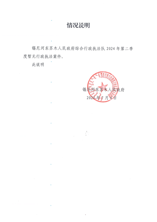 錫尼河?xùn)|蘇木2024年第二季度無(wú)行政執(zhí)法案件情況說(shuō)明