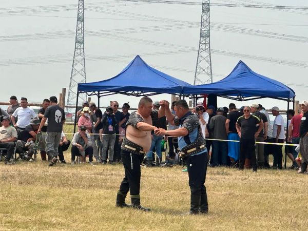 在蒙古式摔跤的場地,兩位身強力壯的勇士,目光炯炯,氣勢如虹,他們雙手張開,步伐穩(wěn)健,充分展現(xiàn)了力量與技巧的激烈角逐,體現(xiàn)出獨具特色的摔跤比賽。
