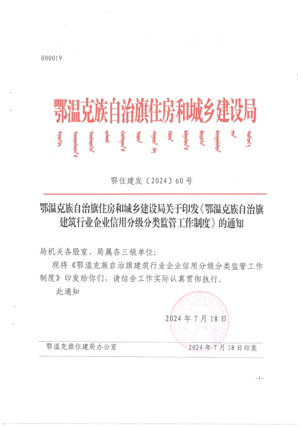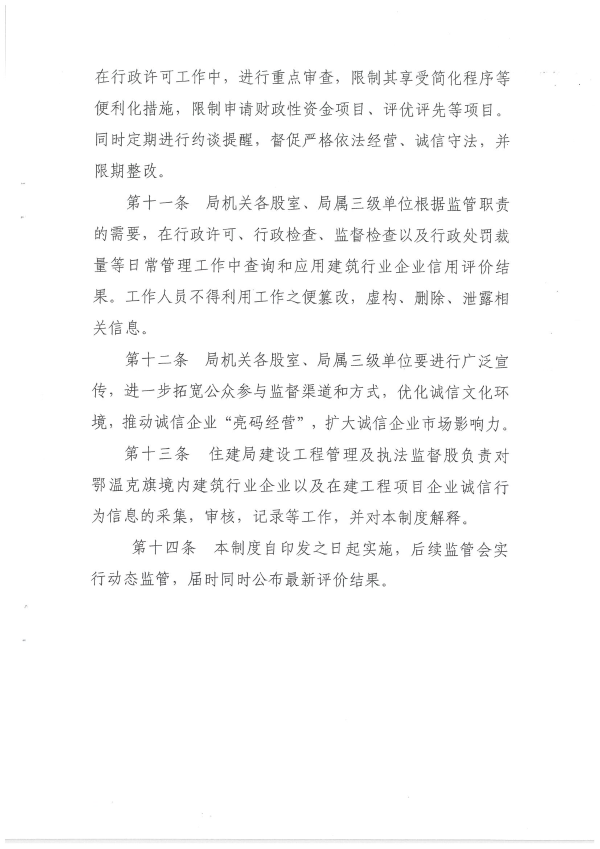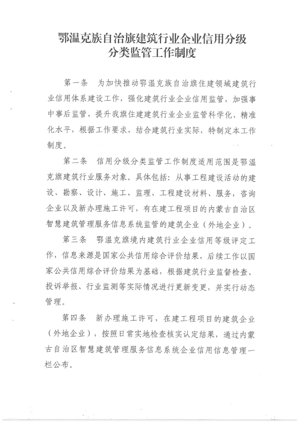 鄂溫克族自治旗住房和城鄉(xiāng)建設(shè)局關(guān)于印發(fā)《鄂溫克族自治旗建筑行業(yè)企業(yè)信用分級分類監(jiān)管工作制度》的通知