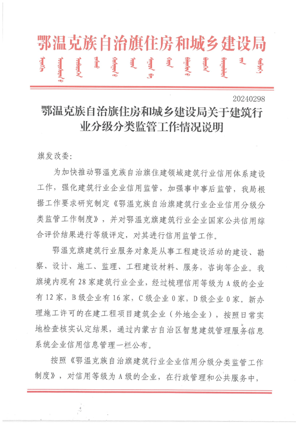 名稱: 鄂溫克族自治旗住房和城鄉(xiāng)建設局關(guān)于建筑行業(yè)分級分類監(jiān)管工作情況說明 文號: