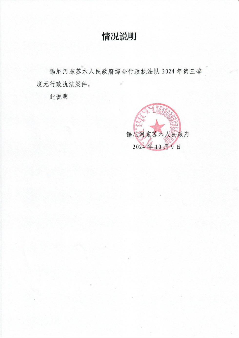 錫尼河?xùn)|蘇木2024年第三季度無行政執(zhí)法案件情況說明