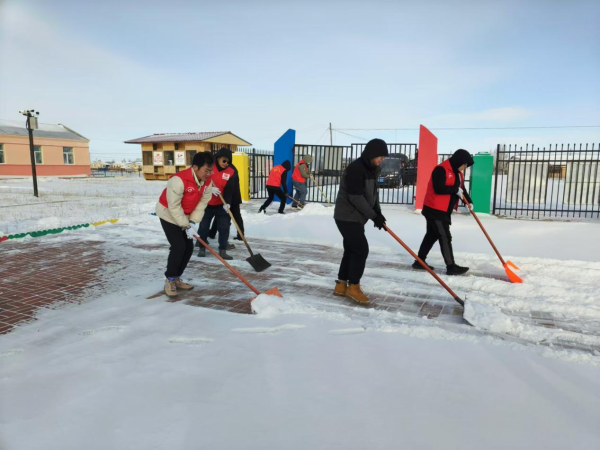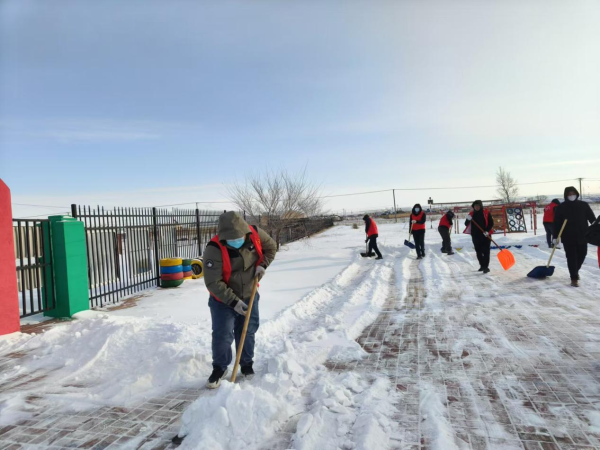 隨后,志愿者們來(lái)到錫尼河?xùn)|蘇木民族幼兒園,開展了清雪除患護(hù)童行的志愿服務(wù)活動(dòng)。志愿者們身穿醒目的紅馬甲,手持清雪工具,迅速投入到清雪工作中。在清理過(guò)程中,志愿者們分工明確、配合默契,手持鐵鍬、掃帚等工具,不畏嚴(yán)寒,齊心協(xié)力為幼兒園清理積雪,確保孩子們的安全出行和校園環(huán)境的整潔。盡管天氣寒冷,但志愿者們的熱情卻絲毫未減,他們用實(shí)際行動(dòng)詮釋著“奉獻(xiàn)、友愛(ài)、互助、進(jìn)步”的志愿服務(wù)精神。