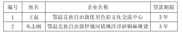 根據(jù)內(nèi)蒙古自治區(qū)財(cái)政廳 人力資源和社會(huì)保障廳 中國(guó)人民銀行呼和浩特中心支行轉(zhuǎn)發(fā)《財(cái)政部 人力資源和社會(huì)保障部 中國(guó)人民銀行關(guān)于進(jìn)一步做好創(chuàng)業(yè)擔(dān)保貸款財(cái)政貼息工作的通知》(內(nèi)財(cái)投〔2018〕444號(hào))、關(guān)于印發(fā)《內(nèi)蒙古自治區(qū)創(chuàng)業(yè)擔(dān)保貸款實(shí)施辦法》的通知 (蒙銀發(fā)〔2017〕82號(hào))及關(guān)于印發(fā)《普惠金融發(fā)展專項(xiàng)資金管理辦法》的通知(財(cái)金〔2023〕75號(hào))文件要求,現(xiàn)對(duì)我旗擬發(fā)放的創(chuàng)業(yè)擔(dān)保貸款人員、項(xiàng)目情況進(jìn)行公示: