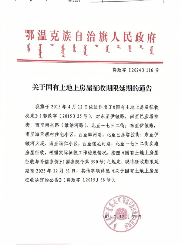 名稱: 關(guān)于國有土地上房屋征收期限延期的通告 文號(hào): 鄂政字〔2024〕116號(hào)