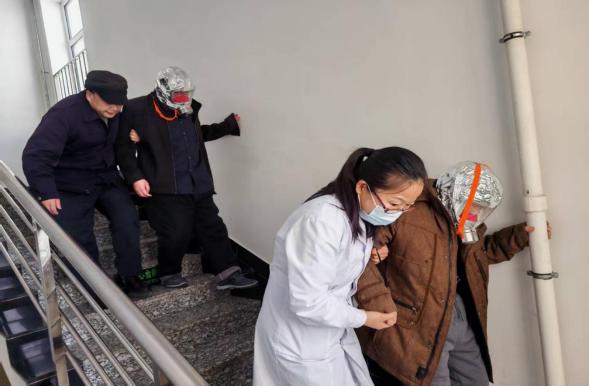 桌面推演結(jié)束后,隨即開展了實(shí)戰(zhàn)演練。隨著一陣急促的警報(bào)聲響起,各部門迅速響應(yīng),護(hù)理人員迅速組織老人戴好消防面罩,低姿彎腰,沿著預(yù)定的疏散路線快速、有序地撤離到安全區(qū)域。