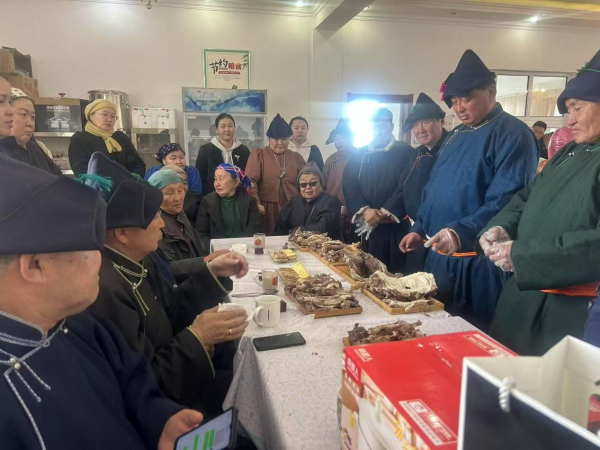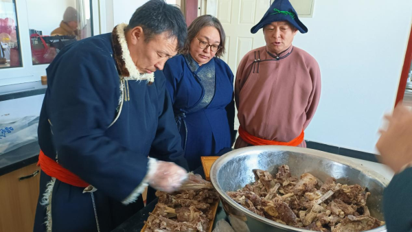 活動中,有五對夫妻和一對母子搭檔報名參賽,女士們制作布里亞特烏日木,各自帶來所需食材和餐具等,精心制作美味的烏日木,傳統(tǒng)的制作步驟+精美的擺盤造型,色香味非常誘人。男士們負(fù)責(zé)傳統(tǒng)布里亞特婚宴上的重要飲食之一羊肉擺盤,也叫紅食擺盤,布里亞特傳統(tǒng)婚宴上給男士客人和女士客人端上的羊肉盤講究各有不同,這里的待客禮儀非常重要,婚宴上紅食擺盤的任務(wù)一般都會由主人家非常信任的男性朋友或親戚負(fù)責(zé),也考驗?zāi)惺總兊闹腔叟c心細(xì)程度?;顒友埩私?jīng)驗豐富的五位長者作為評委,為選手們的作品給出客觀的評價,最重要的是向年輕一代傳授傳統(tǒng)飲食制作技巧和婚禮等重要儀式上的飲食禮儀,更好的傳承和保護(hù)優(yōu)秀的傳統(tǒng)文化。
