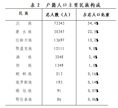 鄂溫克族自治旗是個多民族聚居地區(qū),由25個民族構(gòu)成,少數(shù)民族人口61431人,比上年增加447人,占總?cè)丝诘谋壤秊?5.6%,比上年上升0.4個百分點(diǎn)。