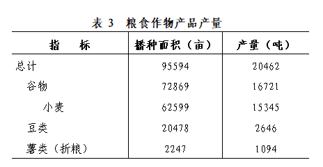 全年糧食產(chǎn)量2.05萬噸,增產(chǎn)69.0%。其中:谷物產(chǎn)量1.67萬噸,增產(chǎn)65.6%;豆類產(chǎn)量0.26萬噸,增產(chǎn)83.2%;薯類產(chǎn)量0.11萬噸,增產(chǎn)93.4%。