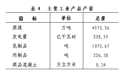 全年原煤產(chǎn)量4575.26萬噸,比上年下降5.6%;發(fā)電量228.55億千瓦時,下降9.7%;乳制品產(chǎn)量1075.67噸,下降12.7%;肉制品產(chǎn)量226.38噸,下降41.1%;商品混凝土產(chǎn)量0.34萬立方米,下降93.7%。