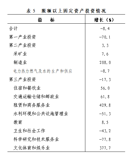 限額以上固定資產(chǎn)投資中,第一產(chǎn)業(yè)投資比上年下降70.1%,第二產(chǎn)業(yè)投資增長3.3%,第三產(chǎn)業(yè)投資下降17.3%。民間投資下降19.2%?;A(chǔ)設(shè)施建設(shè)投資下降19.8%。