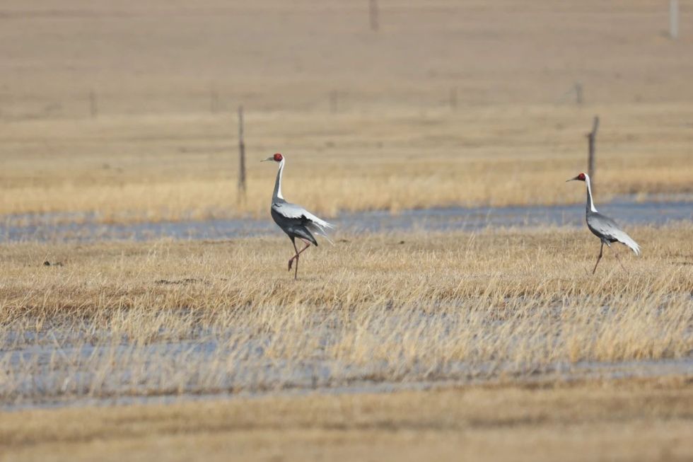 (圖為近期工作人員在莫和爾圖國家濕地公園及周邊區(qū)域開展鳥類監(jiān)測工作中觀測到的國家一級保護動物白枕鶴。)