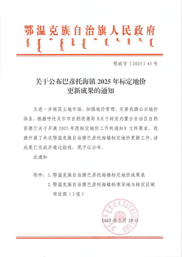 名稱: 關(guān)于公布巴彥托海鎮(zhèn)2025年標(biāo)定地價(jià)更新成果的通知 文號(hào):