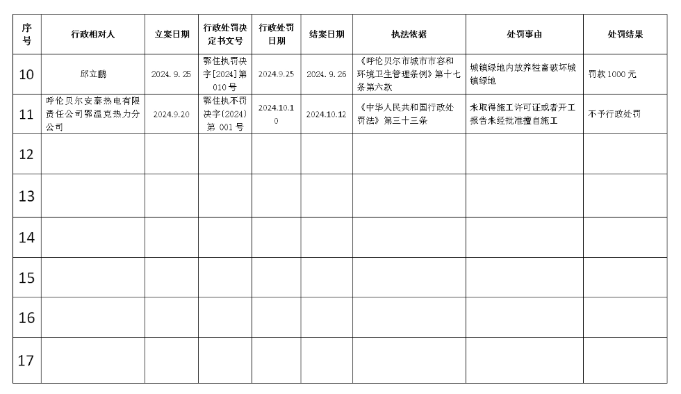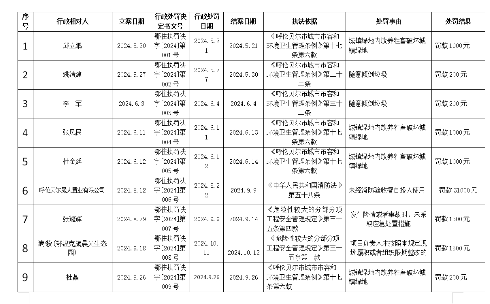 2024年鄂溫克旗城市管理綜合行政執(zhí)法大隊(duì)行政處罰信息表